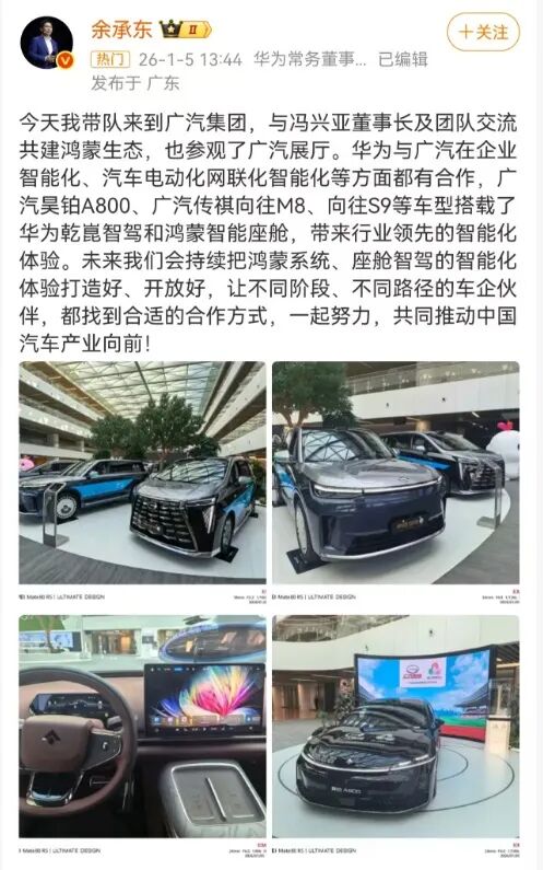 2026年1月5日,余承东发布微博称:“今天我带队来到广汽集团,与冯兴亚董事长及团队交流共建鸿蒙生态,也参观了广汽展厅。华为与广汽在企业智能化、汽车电动化网联化智能化等方面都有合作,广汽昊铂A800、广汽传祺向往M8、向往S9等车型搭载了华为乾崑智驾和鸿蒙智能座舱,带来行业领先的智能化体验。未来我们会持续把鸿蒙系统、座舱智驾的智能化体验打造好、开放好,让不同阶段、不同路径的车企伙伴,都找到合适的合作方式,一起努力,共同推动中国汽车产业向前!”