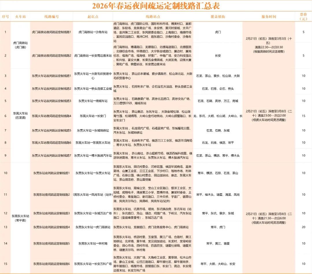 针对东莞东火车站开通6条线路,服务时间从21:30持续至次日6:00,覆盖东城、常平、长安、虎门、凤岗等17个镇街。