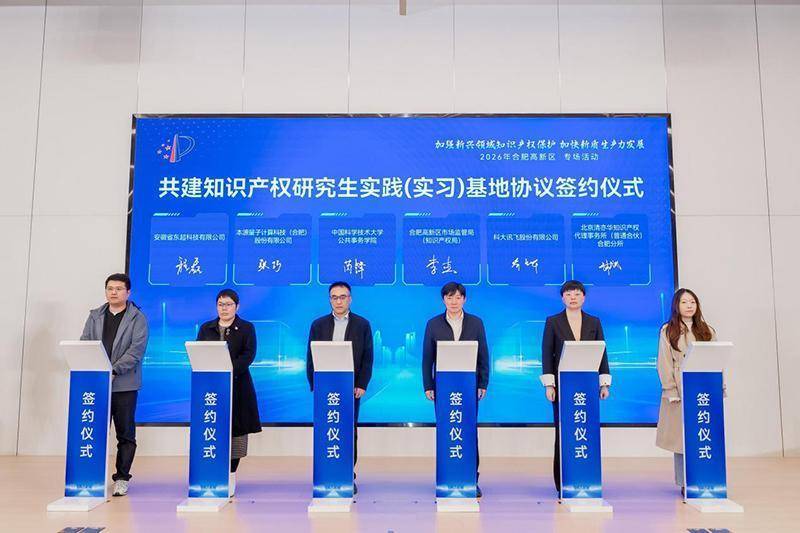知识产权人才培养方面,活动颁发了合肥高新区首届企业知识产权专员系列培训学员证书,40名重点企业学员完成全部课程并获得首批专员证书,优秀学员代表作了交流发言。随后,中国科学技术大学公共事务学院与合肥高新区市场监管局,联合科大讯飞、本源量子、东超科技、清亦华等重点企业,签订共建知识产权研究生实践(实习)基地协议,探索“政府搭台、企业出题、学校育人”的协同培养模式,推动理论教学、实践训练与产业需求深度融合。