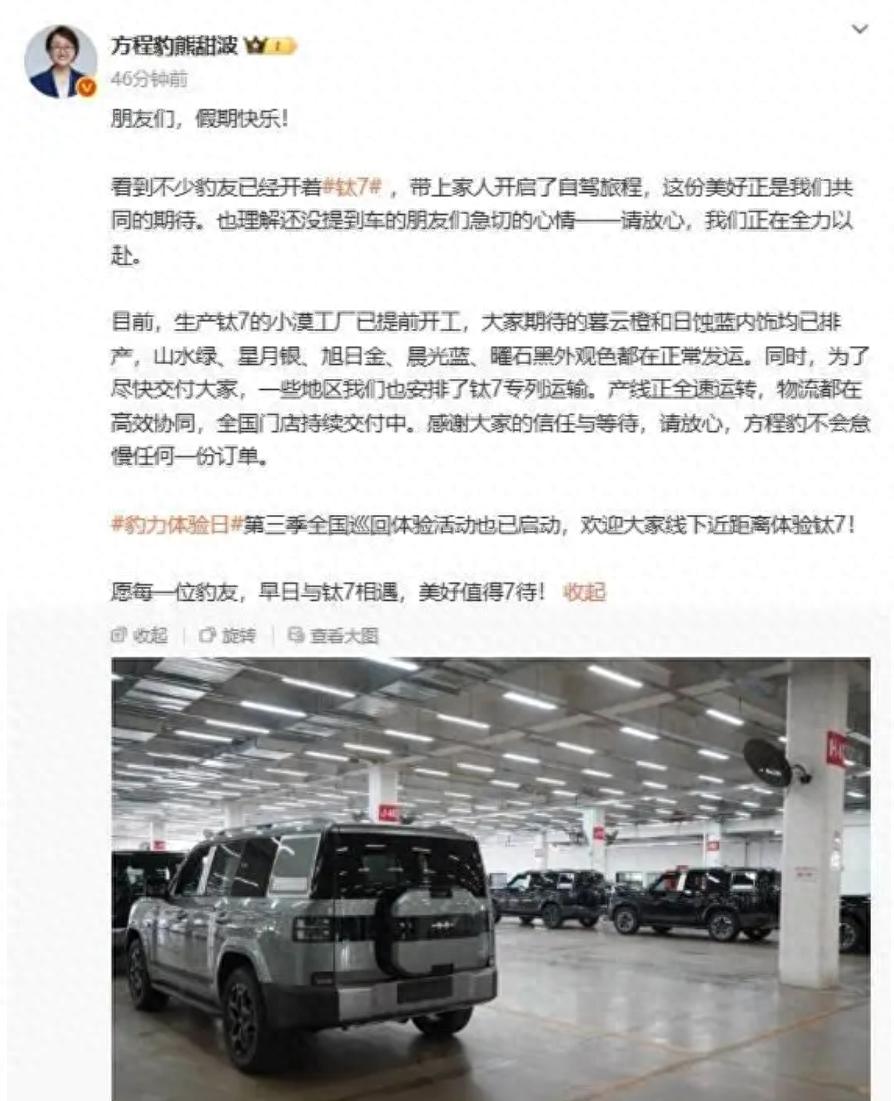 10月4日消息,比亚迪集团-方程豹事业部总经理熊甜波今日发文透露,生产钛7的小漠工厂已提前开工股票知识网,暮云橙和日蚀蓝内饰均已排产,山水绿、星月银、旭日金、晨光蓝、曜石黑外观色都在正常发运。