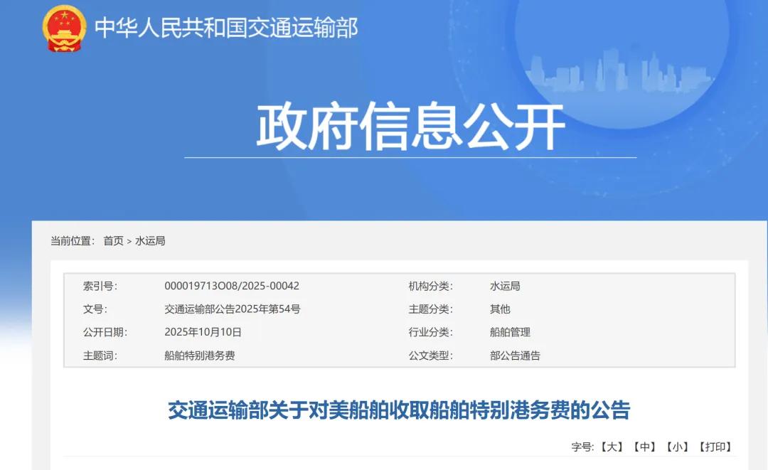 10月10日,交通运输部发布《关于对美船舶收取船舶特别港务费的公告》。根据公告,自2025年10月14日起,将对美船舶收取船舶特别港务费。